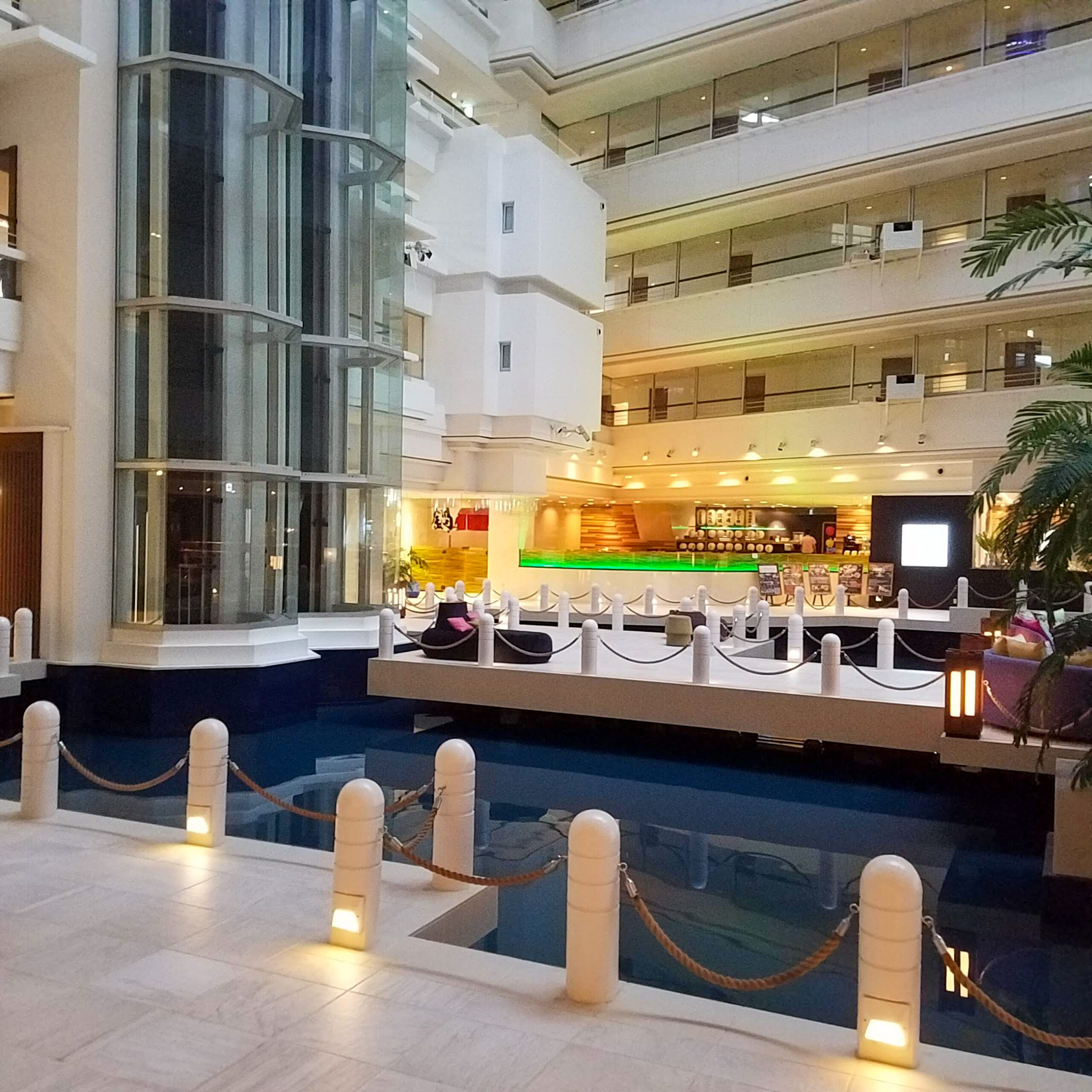 ディナータイムではホテルロビー中央の吹き抜けの白い壁を使ったプロジェクションマッピングが行われており、食事をしながら楽しむことができます。ホテルの目の前はプライベートビーチになっているので、冬でも暖かい沖縄においては、朝食後に海風に吹かれながらビーチ散策しても心地が良いです。(トップ写真は2月に訪れた雲がかかった時でしたので、寒そうに見えそうですが気持ちが良い気候でした。)観光地に行かずとも、シェラトン沖縄サンマリーナリゾートならリラックスしたホテルステイを堪能できます。また、真栄田岬や万座毛にも近い便利な立地にありますので観光でもオススメのステイ先ではあります。